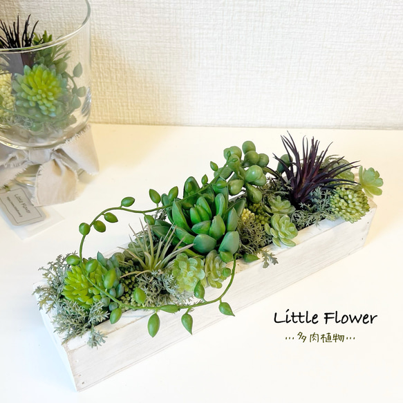 Little Flowerをご覧くださりありがとうございます。人気の多肉植物はどのような用途にもおすすめです♡木製のBOXに多肉植物をアレンジメントしました。アーティフィシャル…